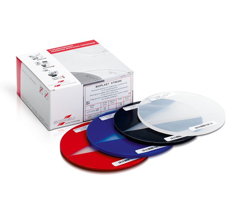 Ideal for creating strong, reinforced mouth guards. The hard, V-shaped layer provides additional protection in the anterior region. Soft layer can be used for lamination with BIOPLAST® or for insertion of the counter bite.